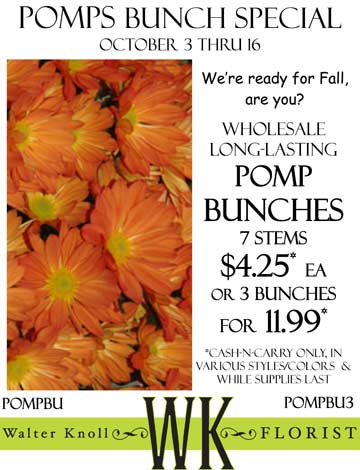We also have a 3-bunch arrangement of Fall Pomps (Chrysanthemums) on special this week at our website, send seasonal and save!
