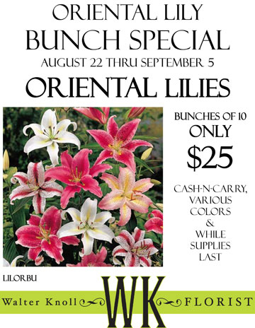 But, never fear! Walter Knoll Florist is here to improve the fragrance of your day! Our wholesale bunch special thru Labor Day (9/5) is Oriental Lilies – bunches of 10 for $25. That’s a lot of blooms and a lot of fragrance!