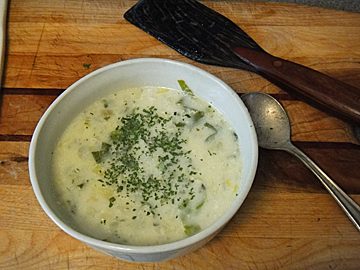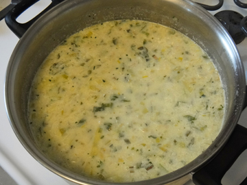 When potatoes are tender, stir in a tablespoon or two of butter and 1/2 to 1 cup of milk. Do not let the soup boil once the milk is added.