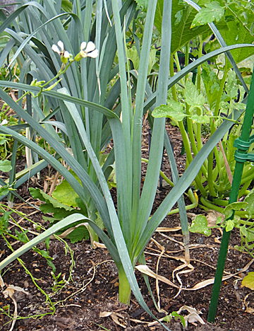 This is my first year to grow leeks and I never got around to looking up care and harvest info on them. A few of my leeks have bloomed – the flowers look like those giant purple allium blooms only they are white. Garlic chives have white blooms also. I noticed on a slice from a leek that had bloomed that the flower stem goes all the way to the root. It was tougher in texture than the other leeks but it cooked up nice and soft.