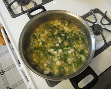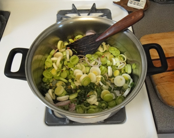 Heat a tablespoon or two of olive oil in a Dutch oven or soup pot. Sauté the diced leeks, shallots, chard stems, celery, jalapeno and minced garlic on medium low for 15 or so minutes until soft and translucent, do not brown.