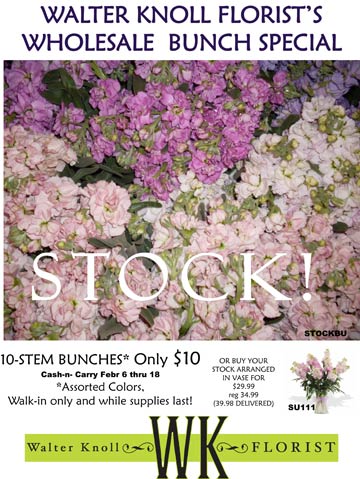 Stop into any Walter Knoll Florist flower shop and pick up a 10-stem bunch of stock for $10 – various colors, walk-in only and while supplies last – this offer is good through February 18.  Tell them Di sent you!  Be sure to visit our online survey (address on receipt) to receive a $5 eVoucher good at wkf.com