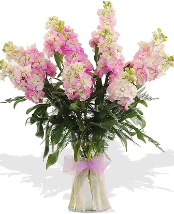 Stock Flowers with their sweet, spicy, clove-like-scented blooms (Malcolmia maritima) is native to the Mediterranean.  They are a symbol of happy life and contented existence.  Colors range from white, cream, yellow, peach, lavender, pink, purple to burgundy.  Stock is also called gillyflower or Virginia stock.  The only special care your stock bouquet requires is frequent change of water and be sure no foliage is below the water line.