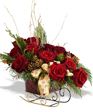 Below is my favorite holiday bouquet from Walter Knoll Florist this year – RIDE – this sleigh comes with 4, 8 or 12 roses arranged with evergreen branches, pine cones, glittery twigs and leaves and faux berries. Enjoy it longer by watering frequently!