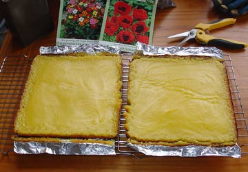 I dug out a favorite lemon bar recipe and doubled it so that I have lots of lemon bars to take to Warren tomorrow! This is a mildly tart lemon bar – if you like it extra tart, add another lemon’s worth of zest and juice.