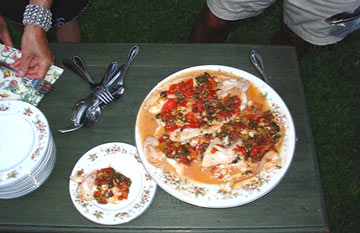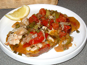 First you make the sauce: In a large skillet and into a bit of olive oil sweat some shallots (2 or 3 small ones) with a tablespoon of dried Herbs de Provence (My big ol’ jar of Herbs de Provence” came from Janet, a souvenier from her trip to France earlier this year!). While the onions were sweating I went out to the garden and gathered tomatoes, oregano, lavender, basil and thyme. I also picked a jalapeno, an Italian hot finger-pepper, a Serrano chili and a sweet banana pepper. I cut each pepper into a different shape (to identify later when I was eating them) and added them with inch thick chunks of tomatoes (about 3 medium sized) to the sweating onions. Cooked them for a minute then added about a half cup of the fresh herbs, finely diced. Then a cup or perhaps a bit less of white wine and about 3/4 cup of Kalamata olives, halved. Simmered it for about 5 minutes then set it aside in a bowl. Rinse and dry the fish fillets, then lay them out on a plate and squeeze half a lemon over them. Cover with saran and refrigerate for about 30 minutes. Blot dry with paper towels just before sautéing them. Use the same pan, just wipe it out and add a tablespoon or two or olive oil – add the fish to the hot oil. When the edges of the fillets were white, I flipped them and poured over the reserved sauce, spreading all the ingredients around well. Only took about 3 minutes each side on the fish. Just before serving, add a couple tablespoons of rinsed capers and another quarter cup of the fresh herbs. Drizzle with a bit of olive oil when serving. The peppers were a wonderful addition to the dish, not hot to bite into but a lingering heat . . . yum yum yum we love hot peppers around here!
