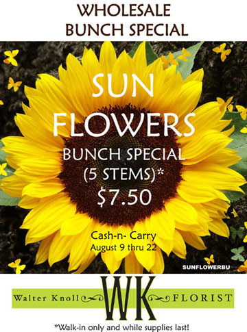 And sunflowers! Back to Sunflowers! One more week of the Walter Knoll Florist wholesale sunflower bunch special – 5 stems for $7.50 as well as many of our sunflower bouquets are at special pricing!!
