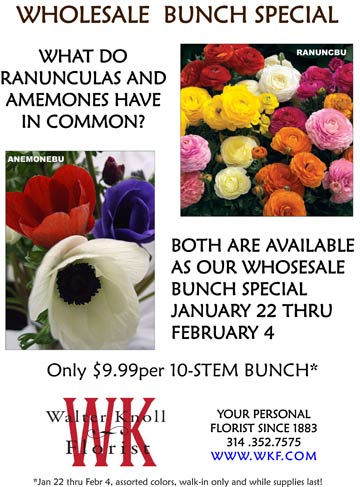 10-stem bunches of Ranunculus or Anemones available at all Walter Knoll Florist flower shops for $9.99 through February 4. Various colors and while supplies last – walk in only –
