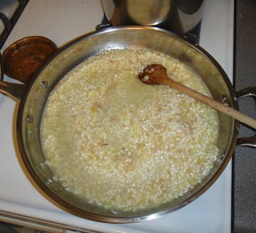 Add the broth a ladel or 2 at a time, stirring occasionally and waiting until it is absorbed before adding more.