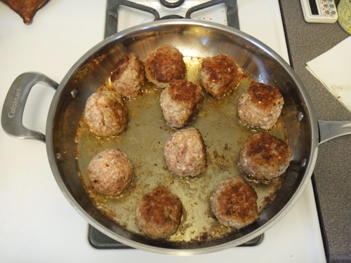 Heat a pan with oil until hot then begin frying your meat balls.  If you turn the heat down low before putting the balls in the pan you will get less splattering.  Arrange the meat balls in a single layer and spread them somewhat apart so they have a chance to brown instead of steam. You may need to do this in batches. Brown the meatballs, over high heat, turning them so they brown all around.