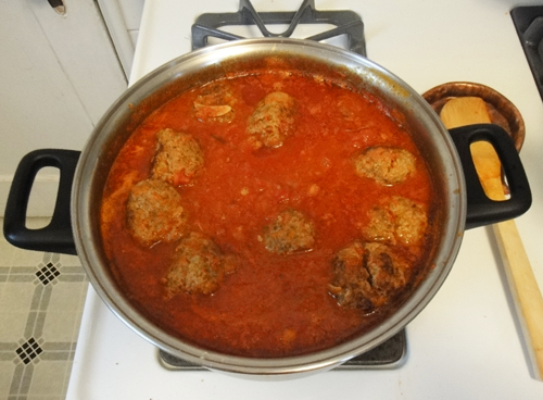 Add the meatballs to the hot tomato sauce and allow them to bubble slightly and simmer over very low heat for a few minutes. Shut off the heat and allow the mixture to rest for a few additional minutes before serving.