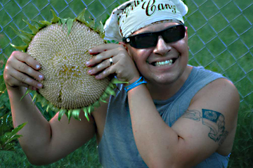 This year my neighbor had a wild one show up in his garden along our fence – the mama of all sunflowers!