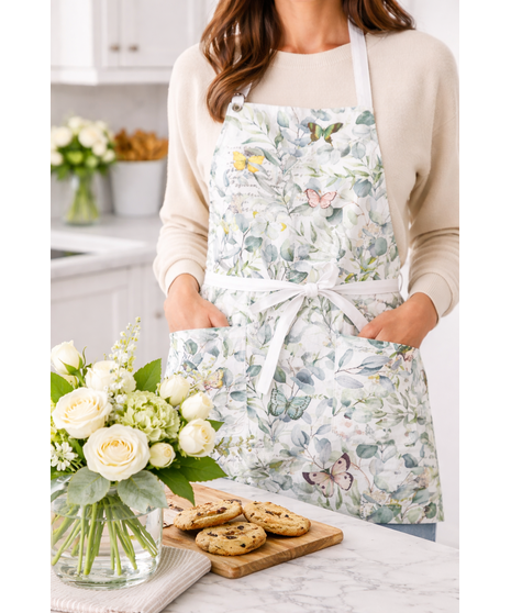Designed for comfort and versatility, the Butterfly Apron includes an adjustable neck strap and roomy front pockets — perfect for holding utensils, recipe cards, or your phone while cooking, baking, or entertaining. The soothing eucalyptus tones and gentle butterfly accents create a fresh, uplifting look that feels right at home in modern, farmhouse, or cottage-style kitchens.