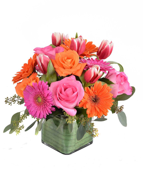For a bright and unusual bouquet we offer up this vivid mix of roses, Gerbera daisies and tulkps - arranged with seeded eucalyptus in a leaf ribbon lined glass cube vase.. Shown is our 4" vase and our deluxe version has more flowers and is arranged in a 5" cube vase.