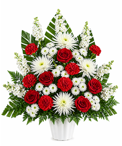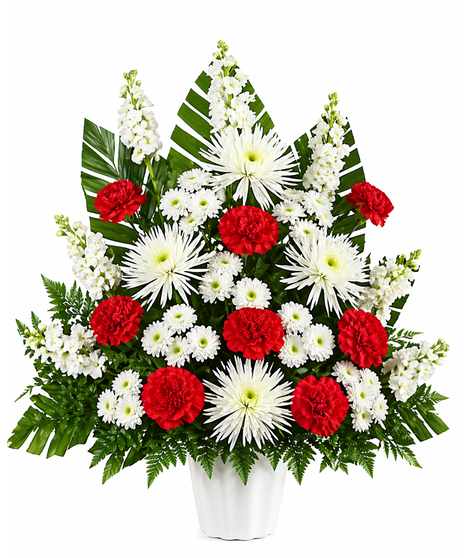 Traditional sympathy design in red and white: fuji mums, daisies, carnations, with mixed floral greens & mixed flowers in a classic fan shape. Suitable for visitation and funeral service at the funeral home or church.