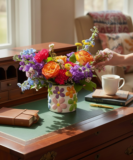 With its bright color palette and nostalgic flower-power charm, this arrangement feels like a sunshine-filled spring afternoon. The whimsical daisy pot adds personality and keepsake appeal, making it a perfect gift for birthdays, get well wishes, thank you gestures, or simply celebrating the season.