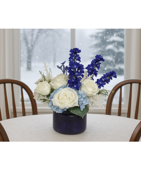 Introducing Frozen, a cool and elegant winter arrangement in shades of icy blue and crisp white. Light blue hydrangeas, vibrant blue delphinium, and snowy white roses come together with frosted artificial pampas for a fresh, serene look.