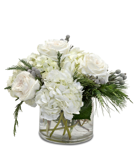 Elegant shades of White and Ivory hues overflow with this extremely polished cylinder centerpiece. Snow white hydrangeas are nestled between rich wintergreens. Draping cedar and pine poke through the design with firm myrtle stems. Stunning White Playa Blanca Roses are the main feature with petite silver brunia berries bring romance