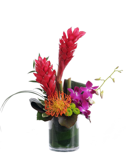 Experience the Hawaiian spirit of warmth and affection, 'Pumehana', with our extraordinary flower arrangement. A spectacular blend of exotic island tropicals like ginger, protea, dendrobium or mokara orchids, and galax, this display brings a piece of the tropics straight into your space. Nestled within a ti leaf-lined cylinder vase, the arrangement is a sight to behold, stirring a sense of peace and tropical allure.