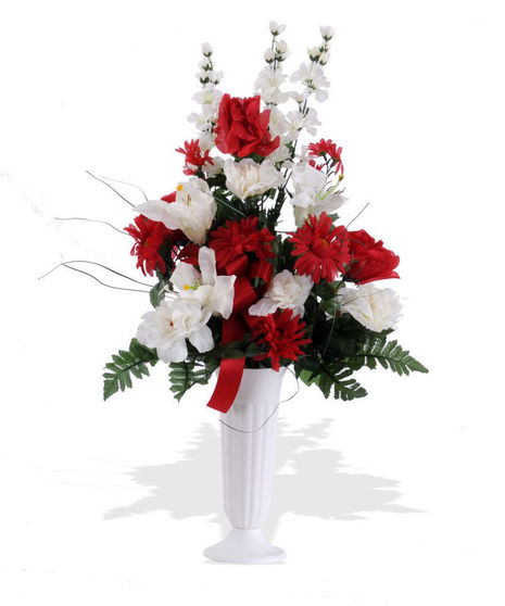 This item is a cemetery cone grave decoration and not suitable for funeral. As shown is our silk cemetery cone display in red and white - in 2 sizes - Similar look and feel can be designed in Fresh seasonal flowers - Please select FRESH or SILK in Options.
