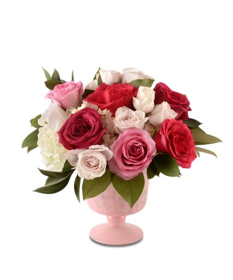 Soft petals and timeless elegance come together in Rosé Reverie, a graceful floral arrangement inspired by the delicate hues of a glass of rosé. Designed in a charming blush pink pedestal vase, this bouquet features a luxurious blend of roses in shades of classic pink, soft blush, and creamy ivory.