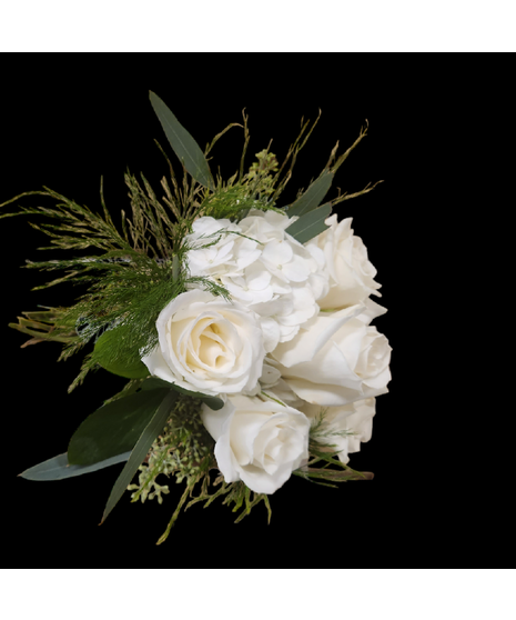 Shown in shades of Ivory and White this piece is perfect for the special occasions. Six premium roses nestled into a base of white hydrangeas.