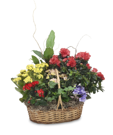 Indulge in the beauty of life as you admire the delicate violet, the cheerful daisy mum, the radiant Gerbera daisy, and the graceful fern. This garden basket brings together a diverse collection of plants, each contributing its unique charm to the ensemble.