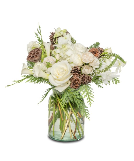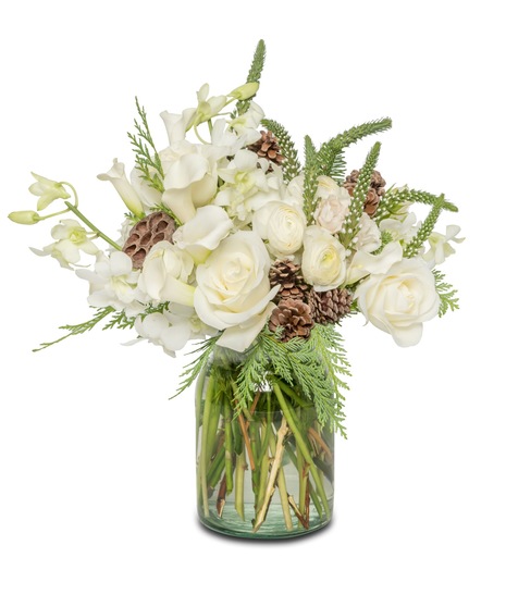 Embrace the tranquility of Winter Woods—a Glass Vase design adorned with fresh white florals. Featuring roses, ranunculus, calla lilies, and orchids, accented by rustic touches of pinecones and lotus pods, this arrangement evokes a serene woodland charm, perfect for capturing the essence of winter's beauty indoors.