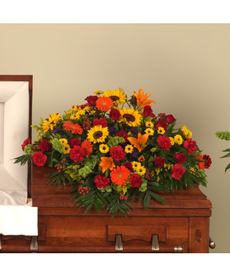 Our Woodland Sunflower Casket Spray is a captivating tribute, uniting the warmth of sunflowers with the vibrant hues of oranges and reds. A tapestry of nature's beauty, this arrangement embodies both comfort and vitality. Majestic sunflowers symbolize adoration, while fiery oranges and reds evoke passion and remembrance. This tribute captures the essence of a tranquil woodland scene, where memories intertwine with the colors of autumn. Crafted meticulously, it honors your loved one with a rustic charm that celebrates their life's journey. As sunlight filters through the trees, let this casket spray illuminate cherished moments and reflect the enduring spirit of your dear one.