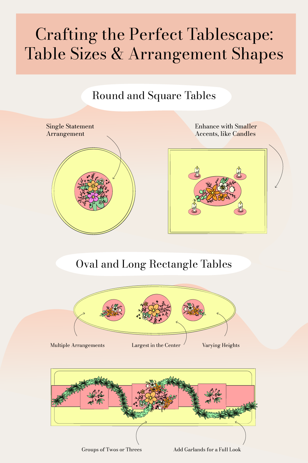 In addition to size, the shape of your table will also lead you to a specific kind of centerpiece. Perfectly round and square tables are ideal for a single statement arrangement. It can be a bit more dramatic, as it serves as the table's focal point. Think lush blooms surrounded by smaller accents like the warm glow of votive candles.