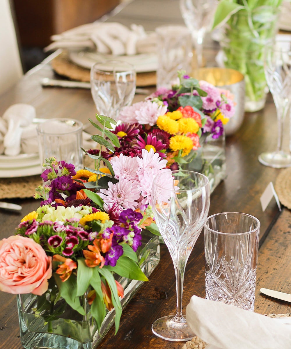 If you have an oval or long rectangle table, create visual interest with multiple arrangements in varying heights, displaying the largest piece in the center and creating symmetry on either side. Add a runner or floral garland for a full and luxurious look. Finish the design by scattering some votive candles and other decorative elements for a fresh, seasonal tablescape. Working in groups of two or three will keep things symmetrical and exceptional from every angle.