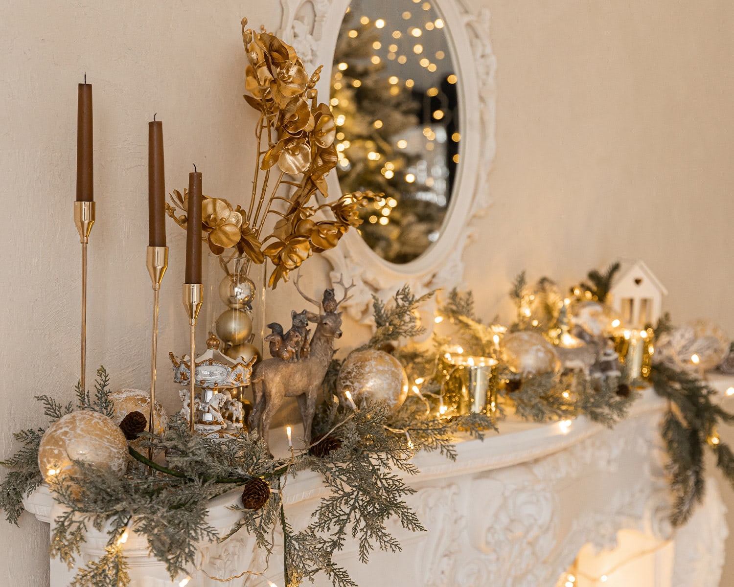 Fresh flowers are the perfect way to balance all that shimmer with a soft, organic energy. White ranunculus, anemones, hellebores, or winter roses grouped in low vases feel modern, elegant, and seasonal. Add in silver brunia, eucalyptus, or dusty miller for texture and winter greenery. Up the fun factor by hanging a festive garland from your bar cart, arranging a floral arch over your snack table, or setting up a photo wall backdrop with metallic fringe or florals for those must-capture moments.