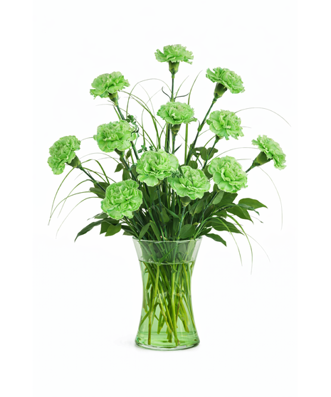 Send one or two dozen festive green carnations in a vase for the season. These carnations are stem dyed and the water color will change as you enjoy them.