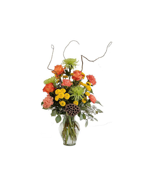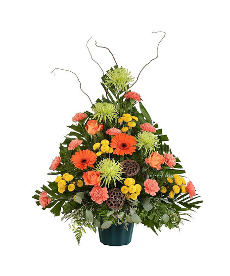 Honor your loved one with a traditional fan-shaped funeral piece that beautifully captures the essence of nature's rustic beauty. Our meticulously designed arrangement features a harmonious blend of vibrant orange carnations, roses, gerbera daisies, asiatic lilies, and yellow button poms.